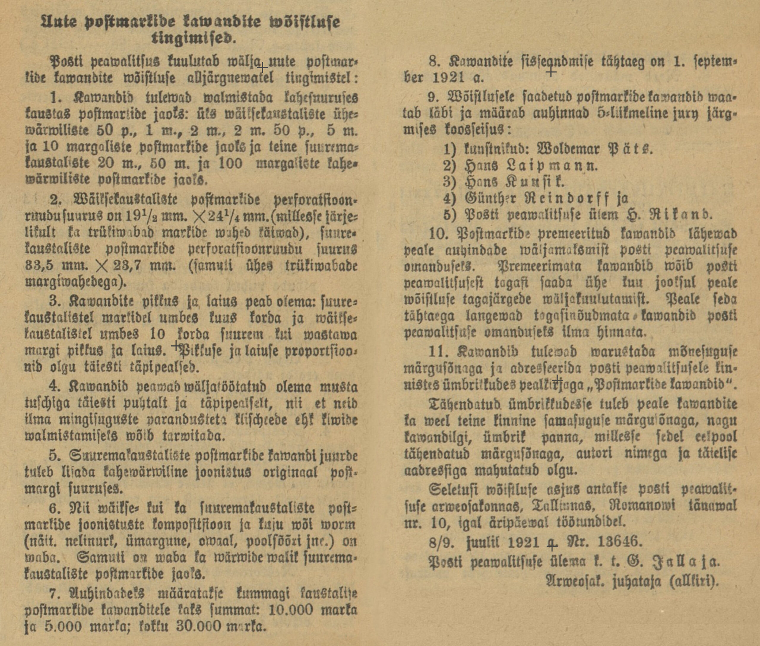 Tingimused (sh mõõdud ja perforatsioon) avaldati Riigi Teatajas nr 60 (19.07.1921, lk 360) ja kavandite esitamise tähtajaks oli 1.09.1921.