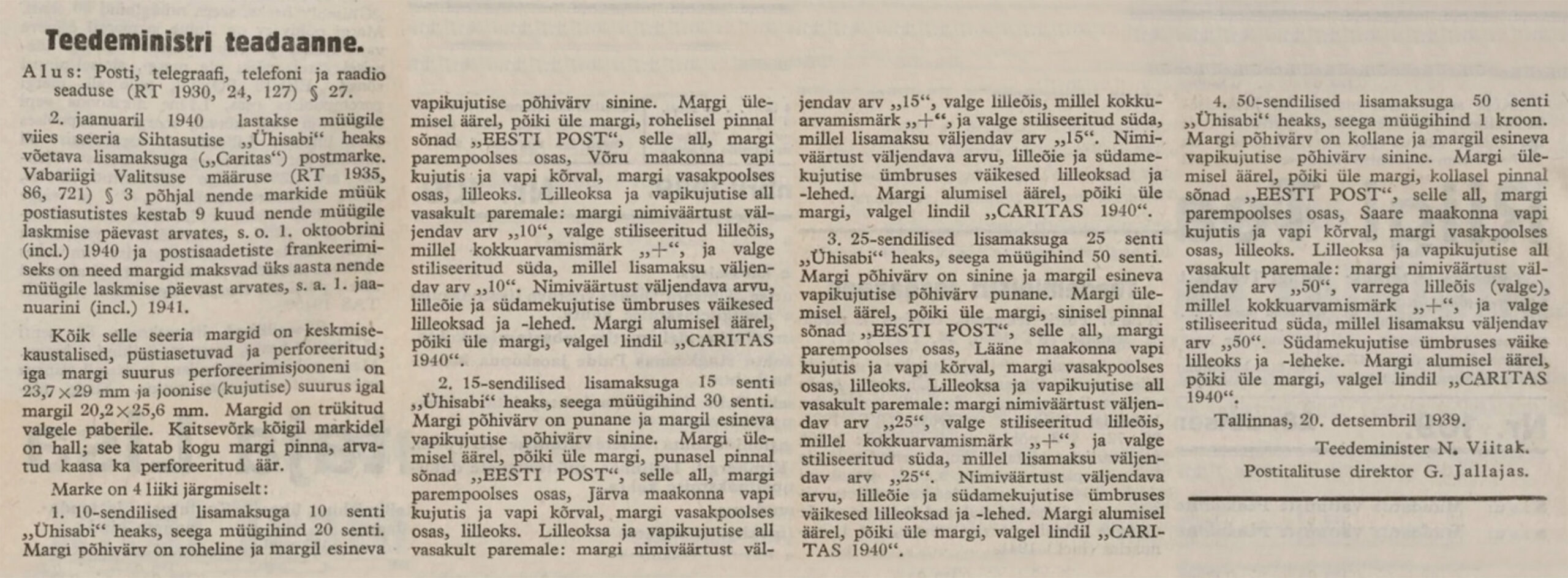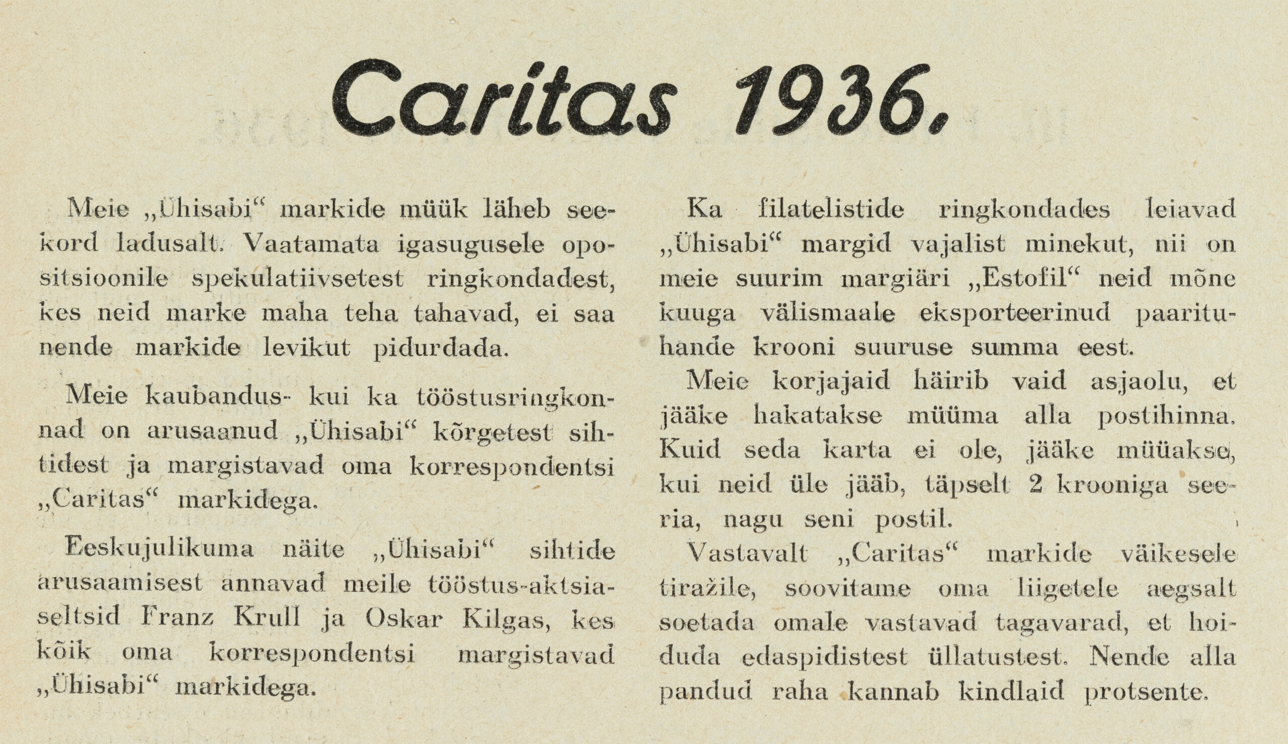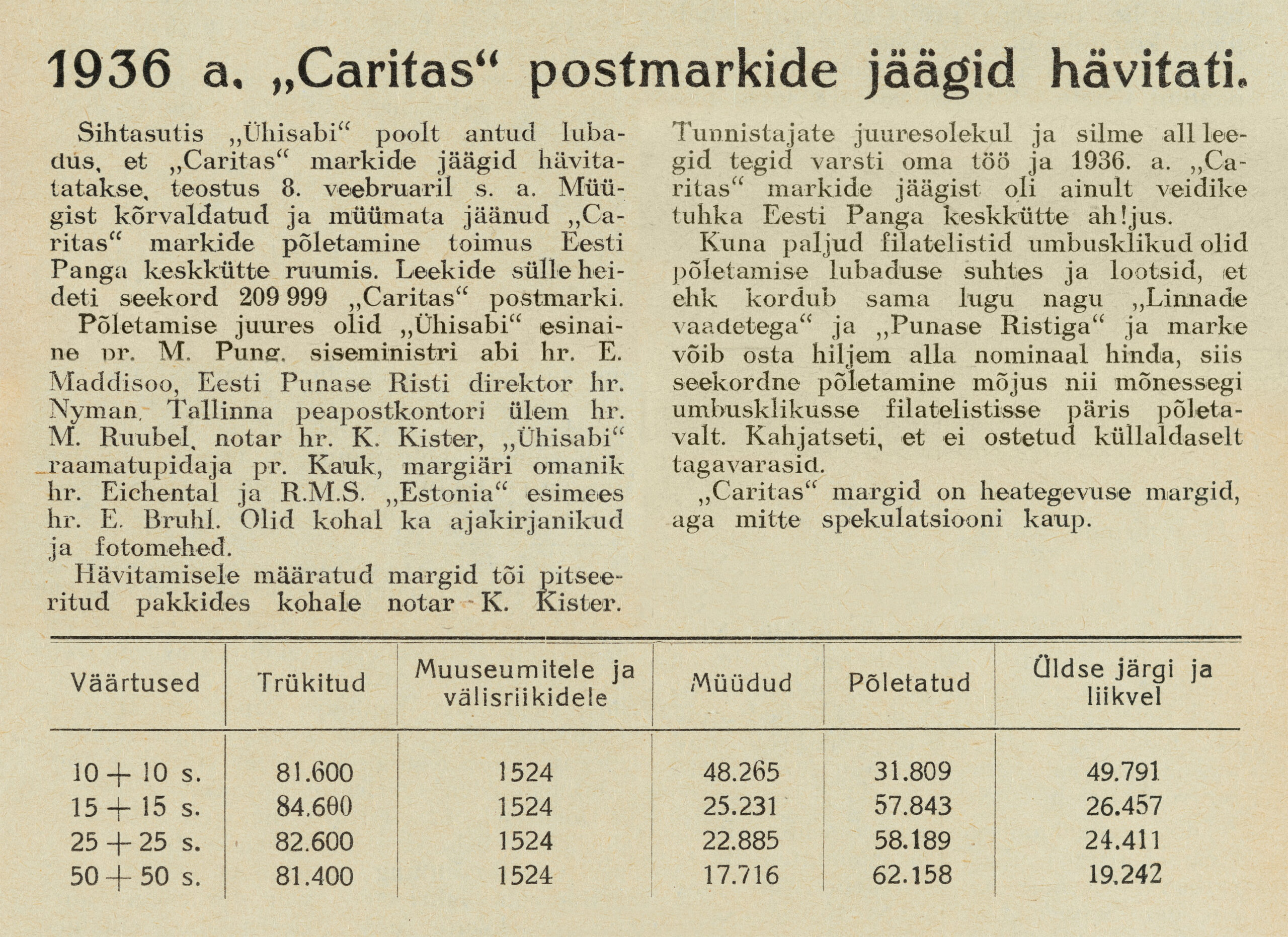 Caritas postmarke trükiti 1936. aastal 320 000 ja need olid maksvad kuni käesoleva aasta 1. veebruarini. Aasta jooksul saadi postmarkidest tulu üle 50 000 krooni, millest 50 % läheb kokkuleppe kohaselt riigile“.