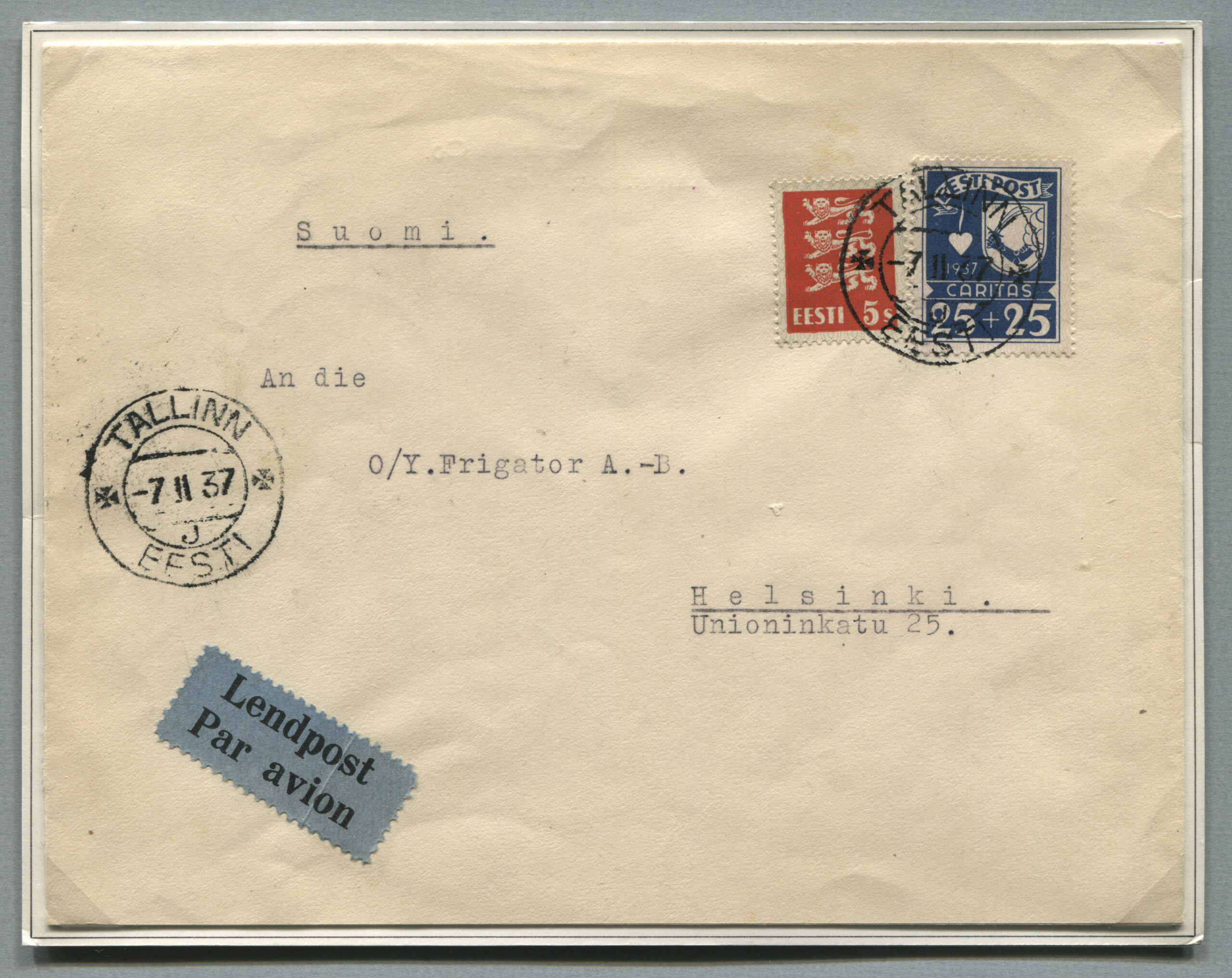 ERMi koguTähitud õhupostikiri Tallinnast 6.02.1937 Helsingisse 8.02.1937.